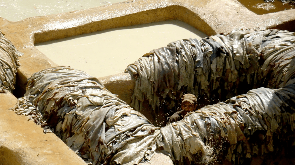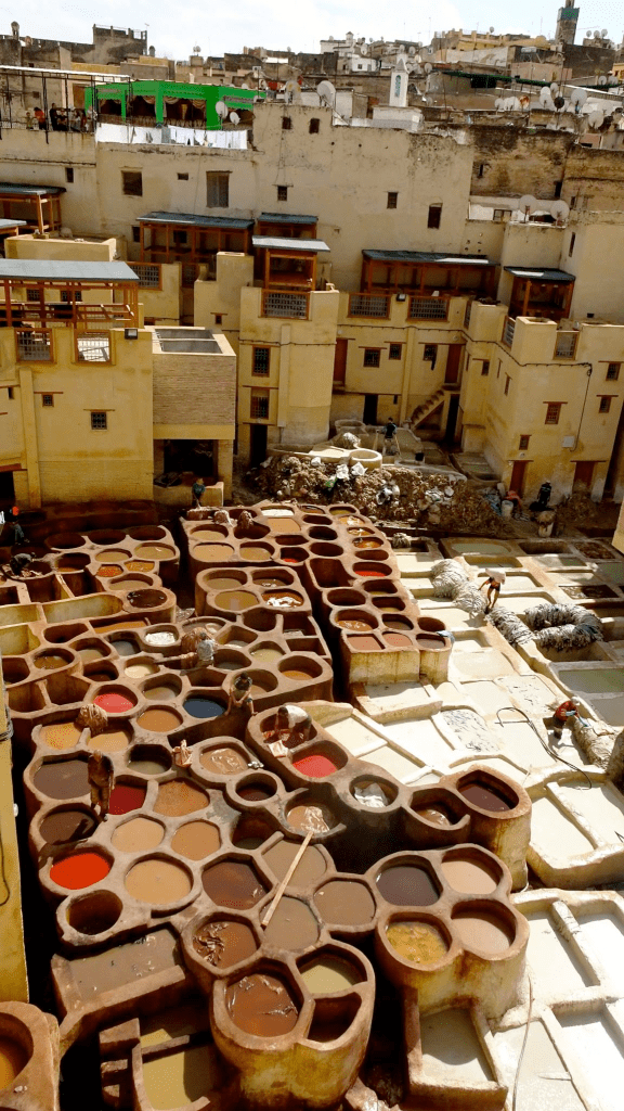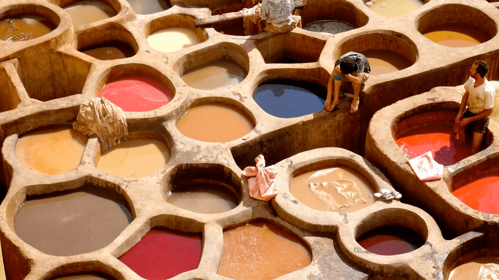 En contrebas, les bassins. Des dizaines de cuves rondes remplies de couleurs vives, presque irréelles. Des hommes y travaillent, les jambes plongées dans les peaux, répétant les mêmes gestes depuis des générations. Ici, le cuir se fait encore à la main, comme autrefois.