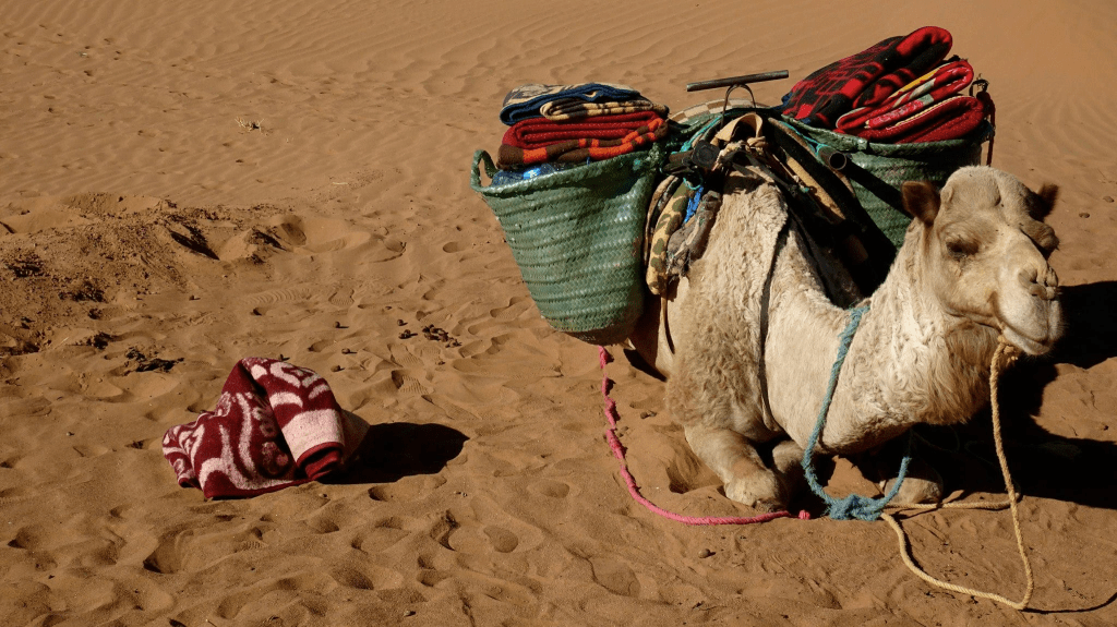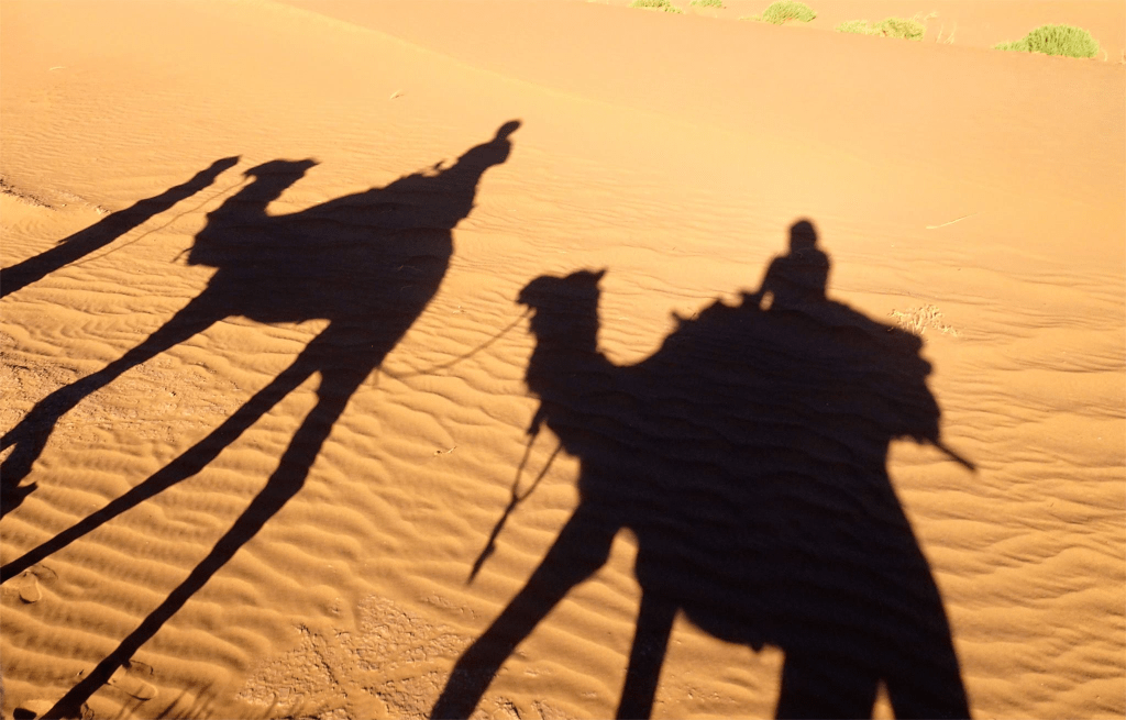 Nous choisissons le forfait d’une nuit en bivouac « sauvage », accompagnés des dromadaires. Dès le départ, l’expérience promet quelque chose de simple et de vrai : le désert, le rythme lent, le silence qui s’installe peu à peu.