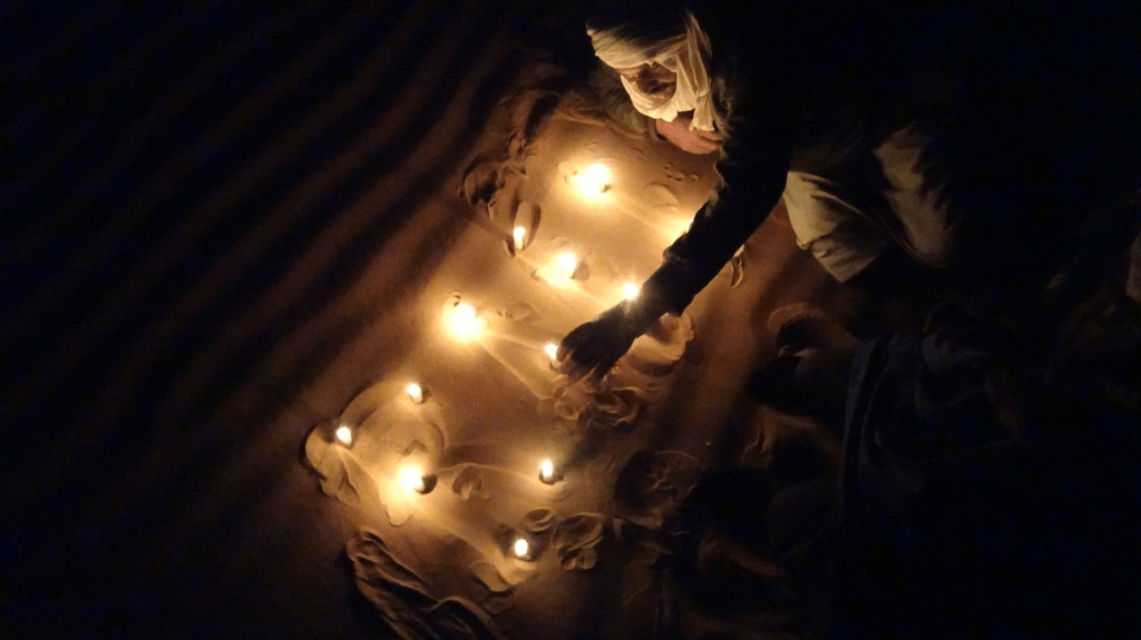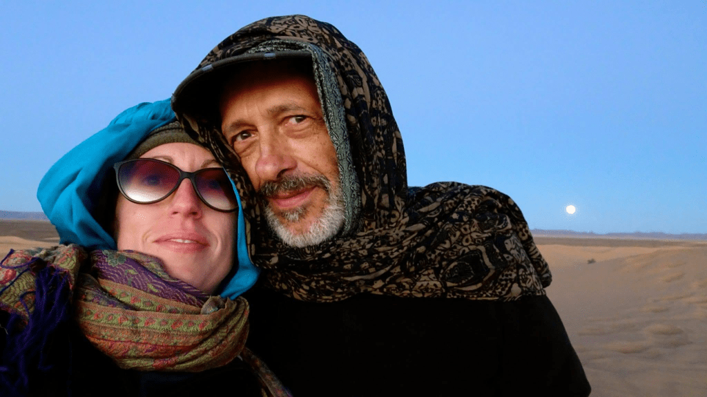 C’est l’anniversaire de mon fils. Quand les nomades l’apprennent, ils improvisent un geste d’une beauté désarmante : un pain cuit directement dans le sable. On n’aurait jamais cru qu’il puisse être aussi bon — pas une miette de sable, seulement la chaleur, le feu et le savoir-faire. Le soir venu, ils prennent aussi le temps d’écrire son prénom dans le sable avec des chandelles. Sous le ciel étoilé du désert, ce moment suspendu devient profondément magique.
