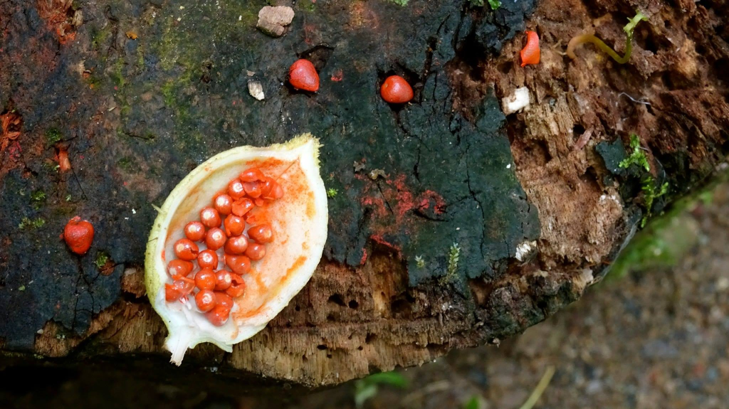 Son fruit renferme de petites graines dâun rouge Ă©clatant.