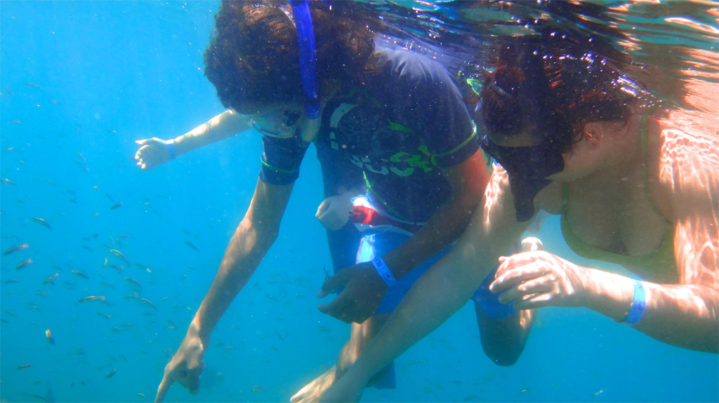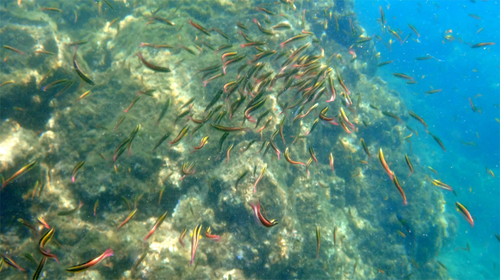 PrĂšs des zones rocheuses, on observe quelques poissons, on flotte tranquillement, portĂ© par lâocĂ©an.
