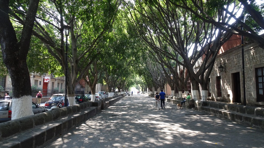 On marche doucement sous les arbres, en profitant de l’ombre et de la perspective élégante qu’offre cette longue allée… jusqu’à arriver à la Plaza Morelos.