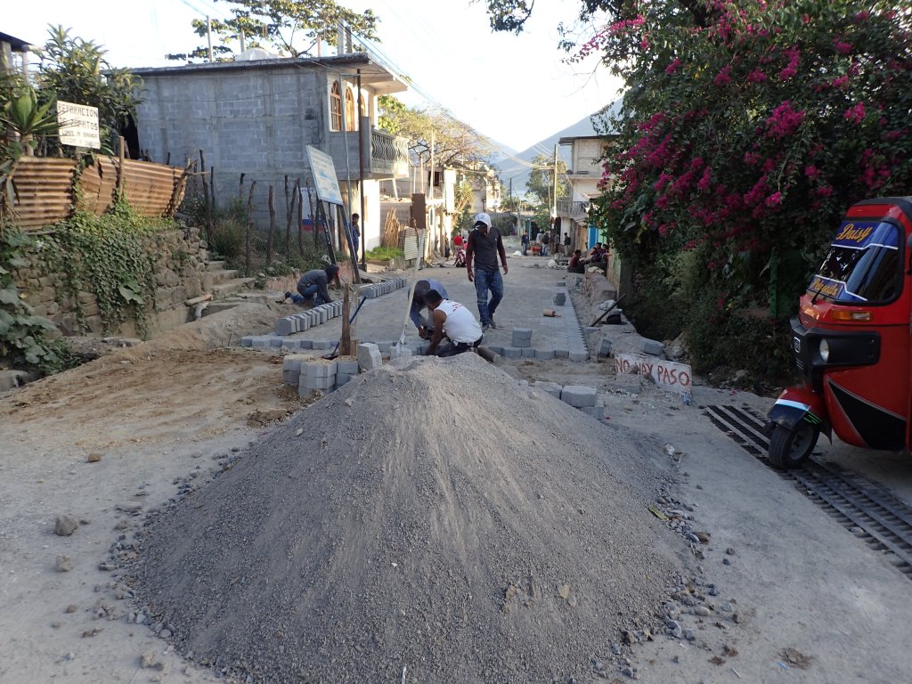 La rue est en réfection, pavage en cours, avec une cinquantaine d’ouvriers à l’œuvre.